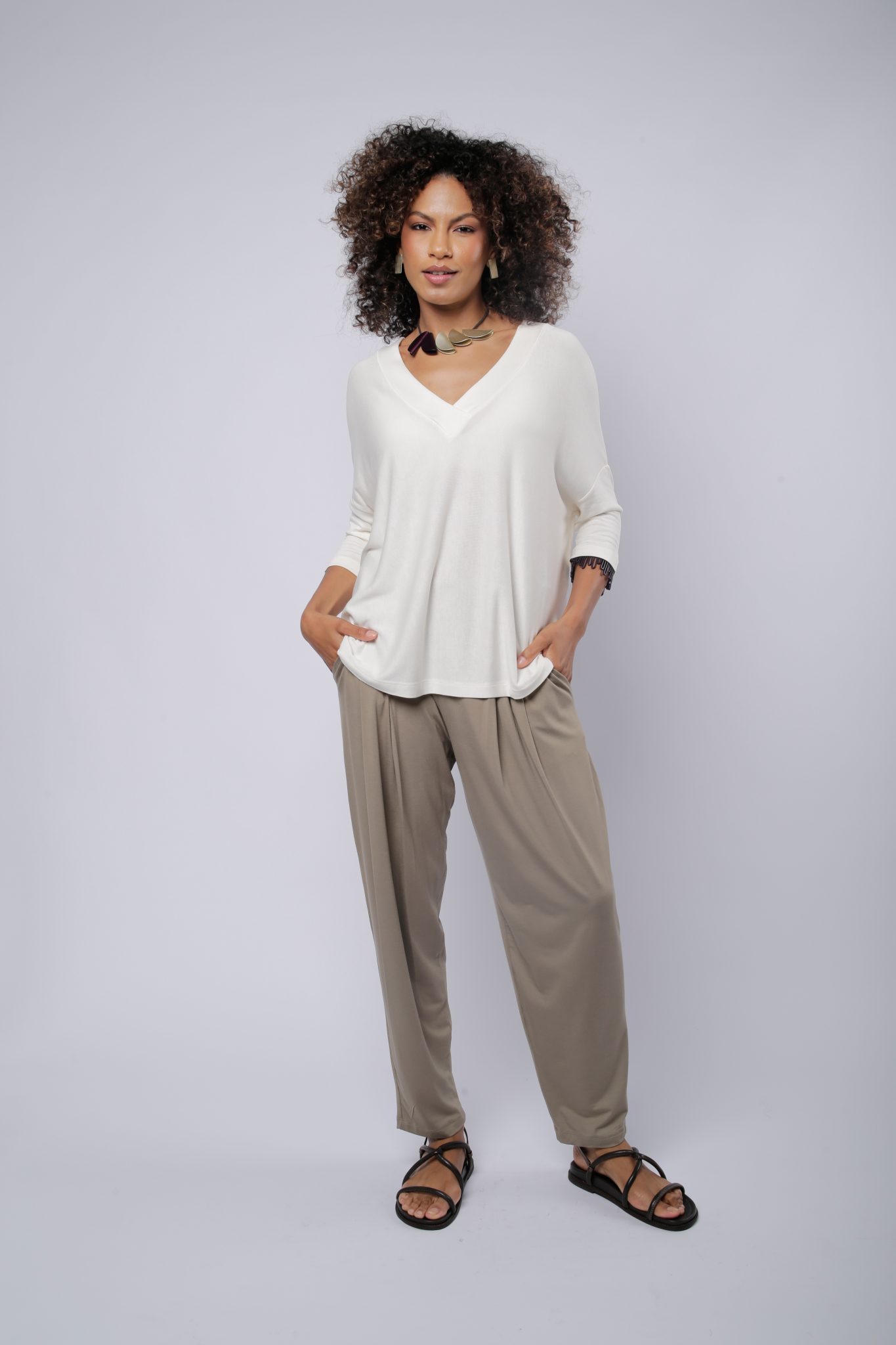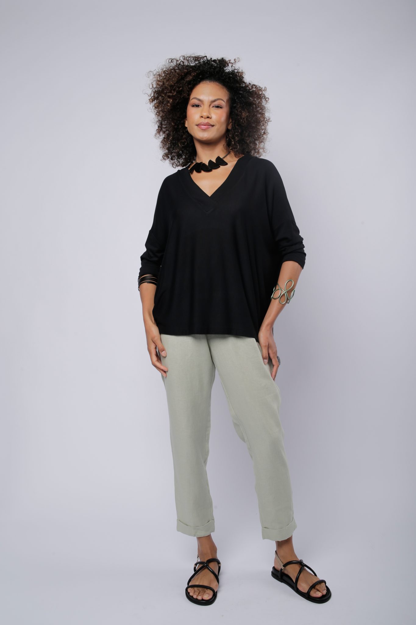 Blusa Ana em viscose com elastano. Seu design moderno conta com modelagem soltinha e decote em V, proporcionando estilo e liberdade de movimento.
