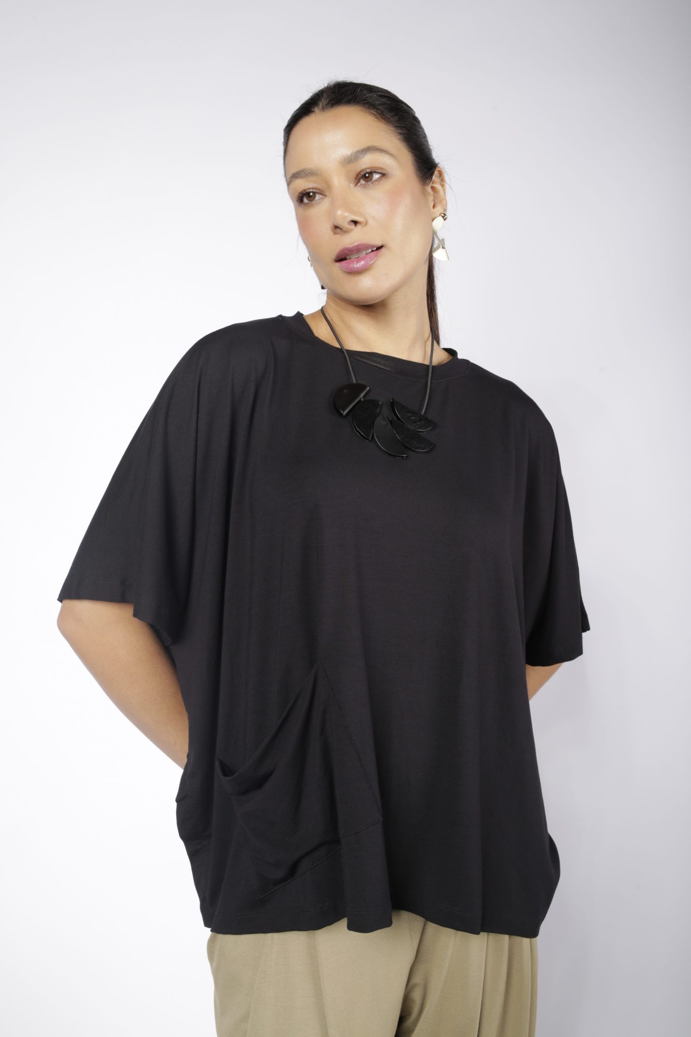 Blusa bolso feminina em viscose com elastano, modelo com mangas curtas, gola canoa e bolso frontal.