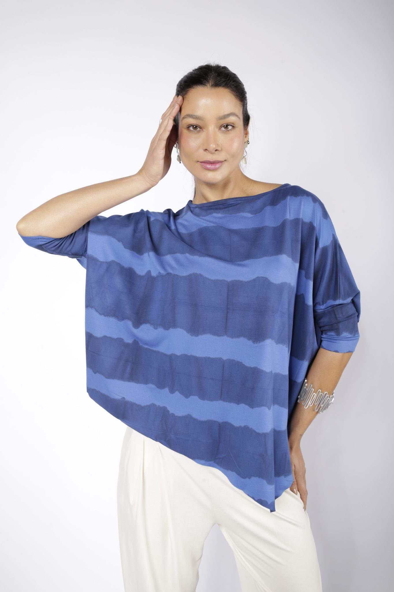 Blusa Diagonal em viscose com elastano, modelo com mangas curtas, gola canoa e barra assimétrica.
