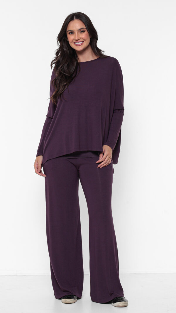 Calça flare em viscose com elastano, bolsos nas laterais, oferecendo conforto e elegância.