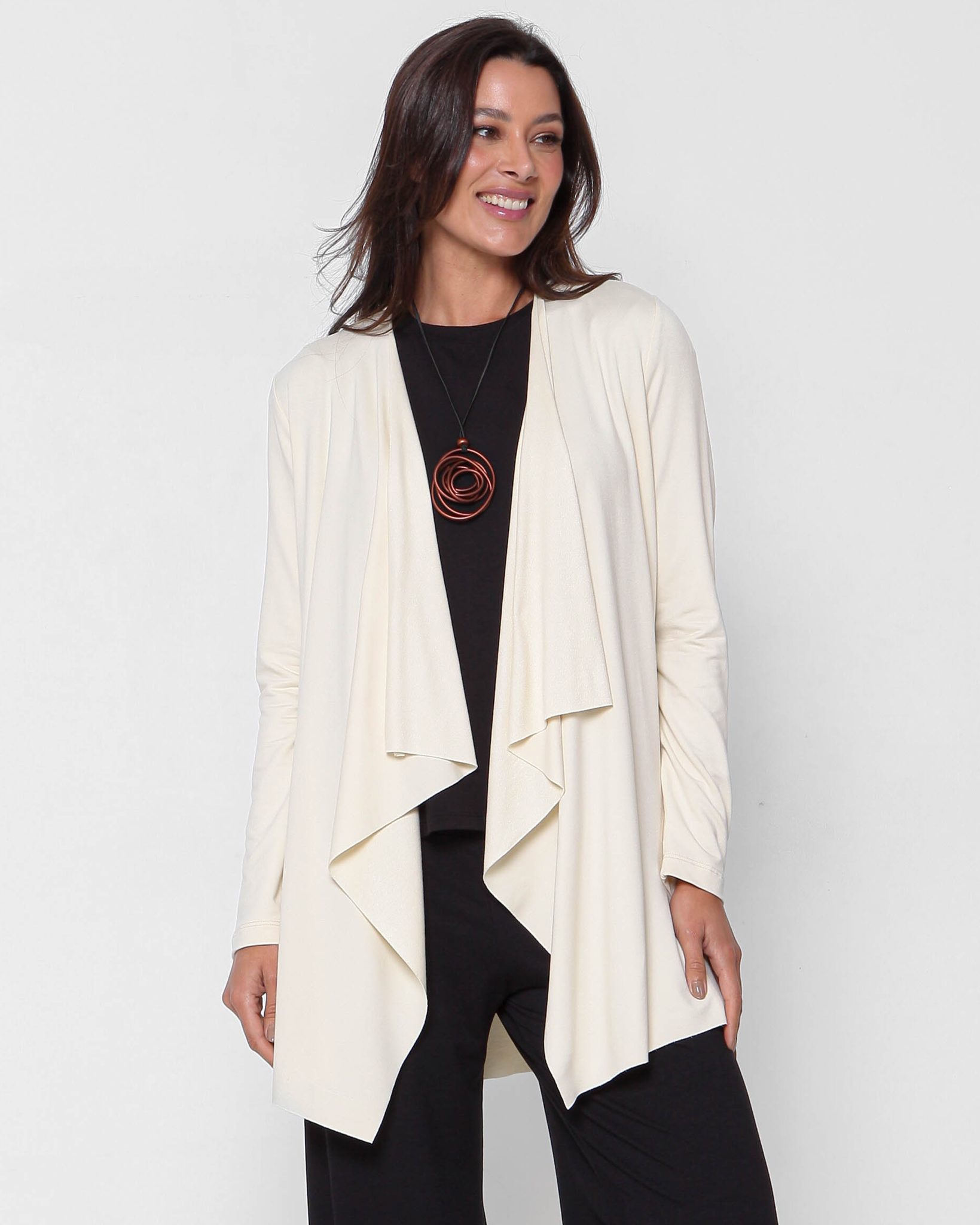 Leveza e sofisticação definem este casaco feminino em malha. Com modelagem solta e caimento fluido, ele traz um charme especial com o detalhe de babados na parte frontal, criando um visual elegante e moderno. A cor off white e preto é versátil e combina facilmente com diversas peças do seu guarda-roupa, perfeita para compor looks casuais ou mais refinados. Confeccionado em malha macia e confortável, é ideal para usar em dias mais amenos, oferecendo estilo sem abrir mão do conforto.