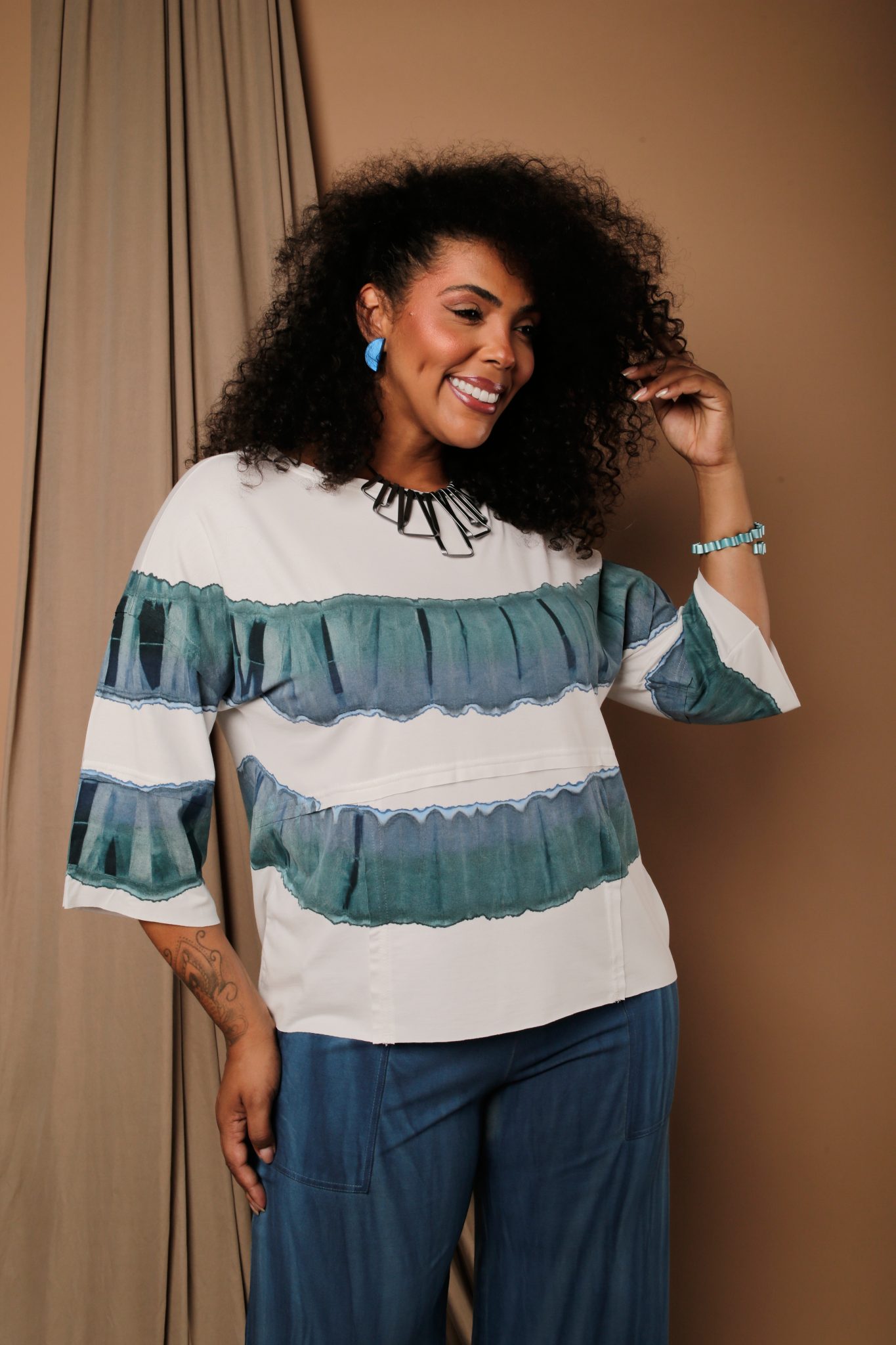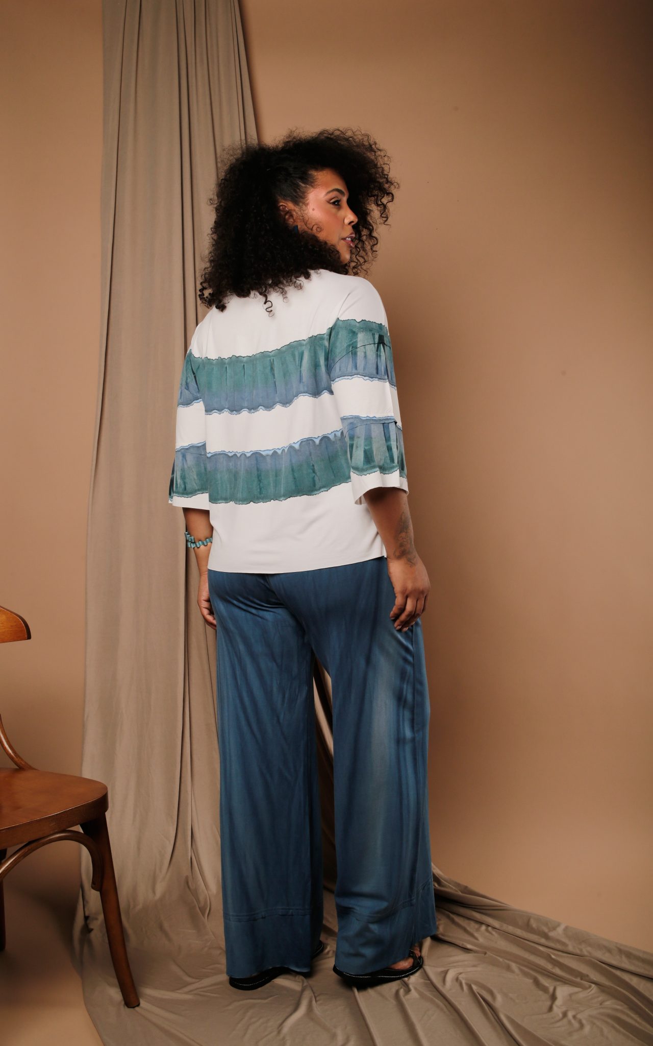 Blusa de manga 3/4, decote canoa discreto e versátil, tecido leve, com toque macio e fluido, ideal para compor looks elegantes. Calça de caimento reto, com bolsos laterais, oferecendo conforto e elegância.