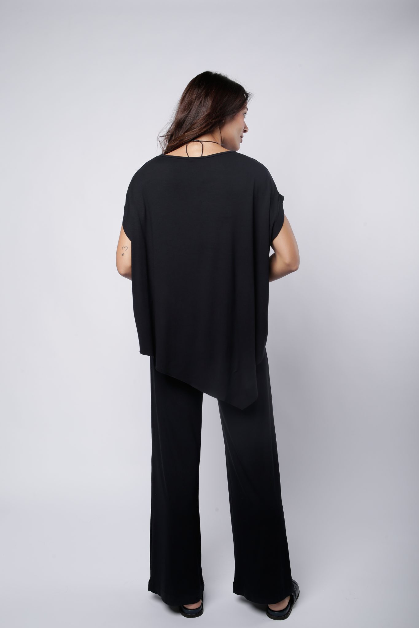 Conjunto em viscose com elastano, blusa diagonal com gola canoa e sem mangas. Calça flare, com bolsos nas laterais, oferecendo conforto e elegância.