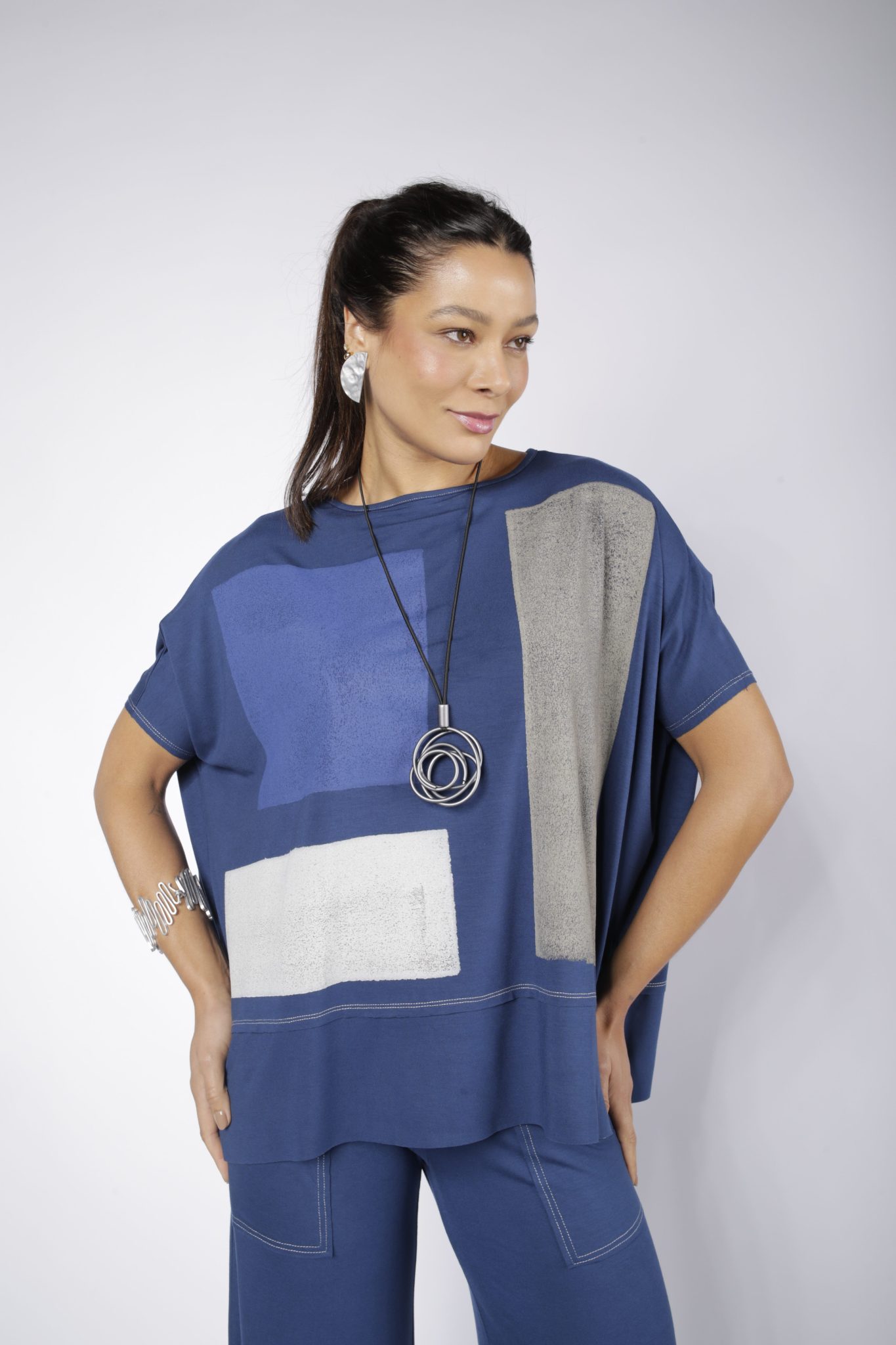 Blusa estampada de mangas curtas, decote canoa discreto e versátil, tecido leve, com toque macio e fluido, ideal para compor looks elegantes. Calça de caimento reto e com bolsos nas laterais, oferecendo conforto e elegância.