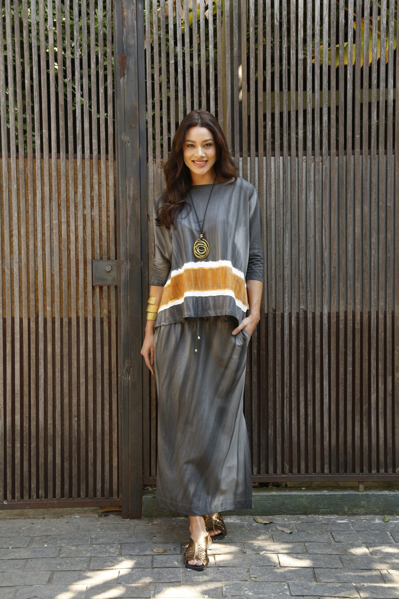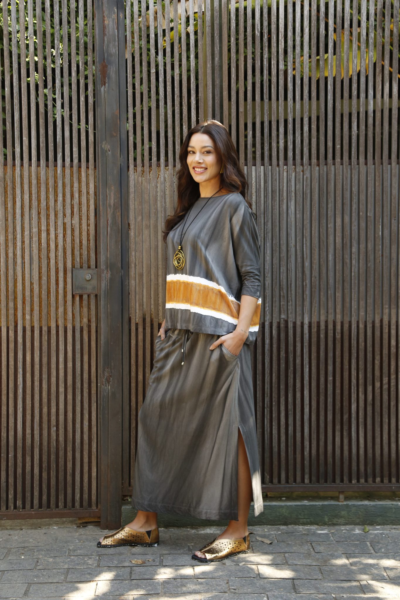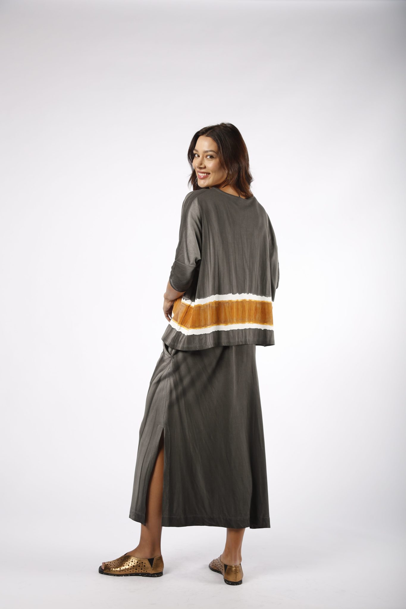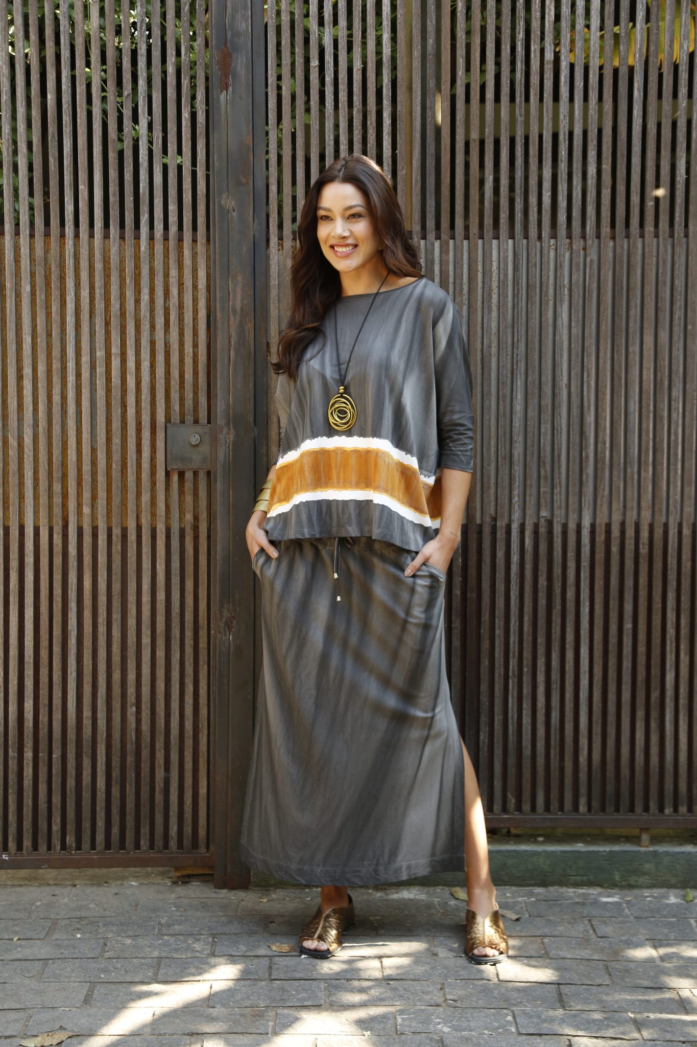 O Conjunto Porto é a opção perfeita para quem busca praticidade e estilo em uma única peça. Composto por uma blusa de mangas curtas e uma saia longa, o conjunto é confeccionado em malha estampada, proporcionando um toque macio e confortável para o corpo. A blusa tem um corte solto e casual, com mangas médias que garantem liberdade de movimento, enquanto a saia longa exibe um caimento fluido e sofisticado, com uma estampa marcante que adiciona um toque moderno e descolado ao look. Além disso, a saia possui bolsos funcionais, trazendo um toque de praticidade ao conjunto. Na cor chumbo, o conjunto é extremamente versátil e fácil de combinar com diferentes acessórios e calçados, tornando-se uma escolha ideal para passeios, viagens ou ocasiões casuais que exigem conforto e estilo.