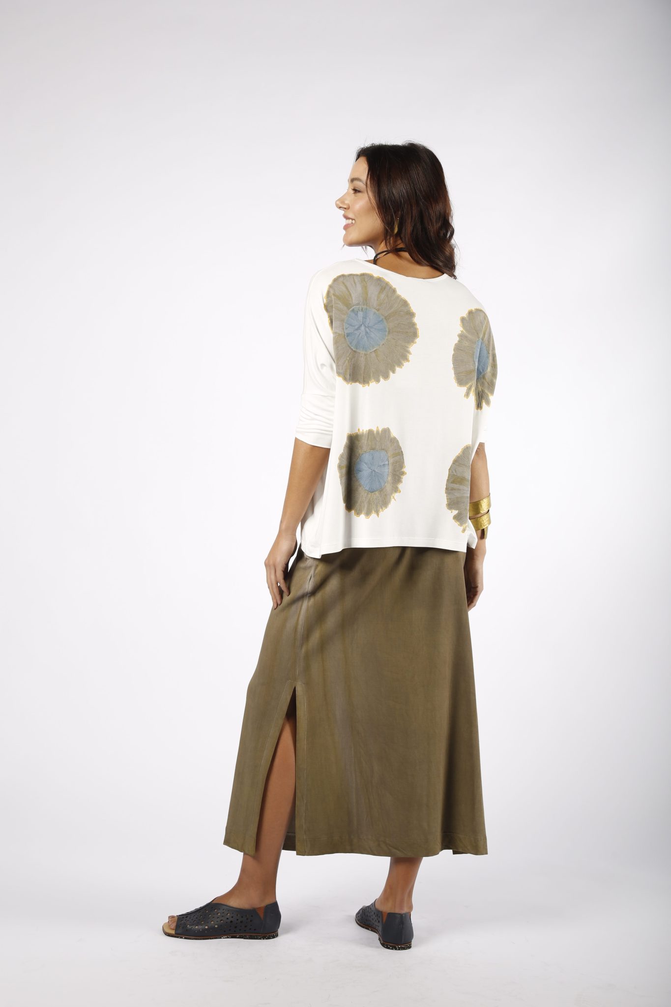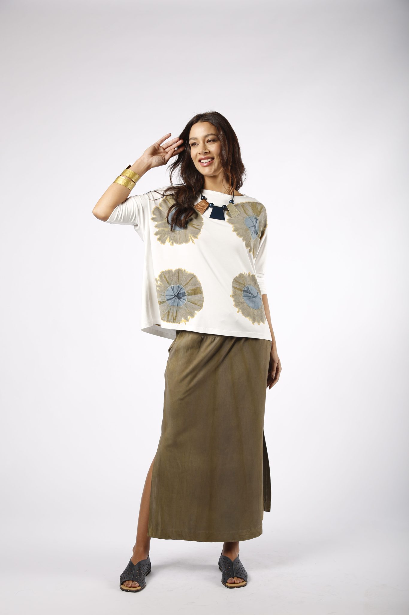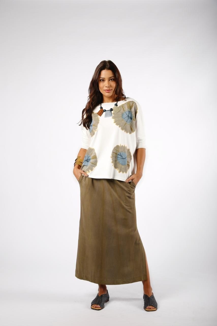 Conforto e estilo em perfeita harmonia! O Conjunto Porto traz uma blusa de manga 3/4 em tom off-white com estampa floral em tons suaves, combinada com uma saia longa em tecido leve e caimento fluido. O visual é complementado por detalhes como bolsos laterais e uma fenda discreta, garantindo praticidade e sofisticação. Ideal para quem busca um look casual com toque artístico e moderno.