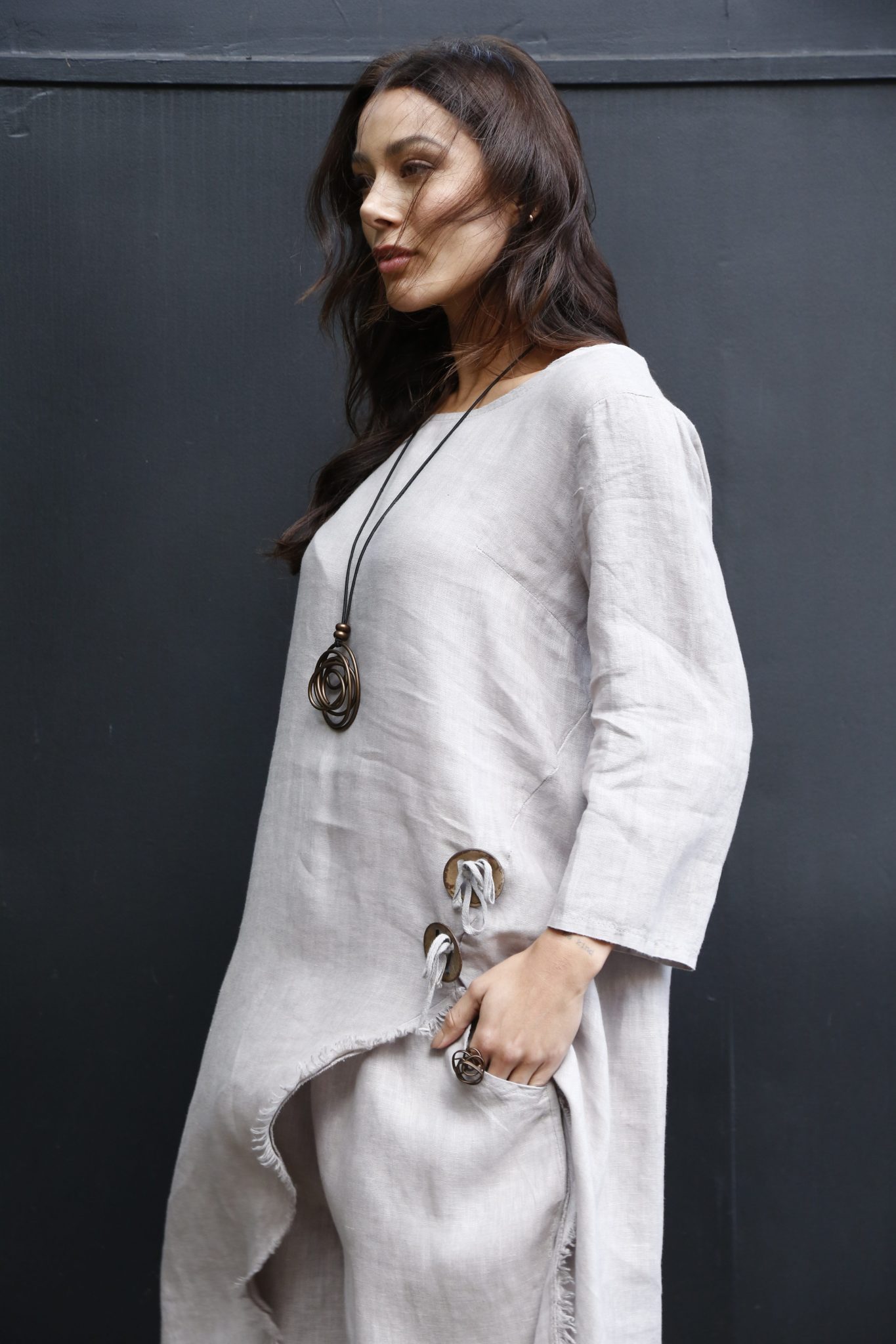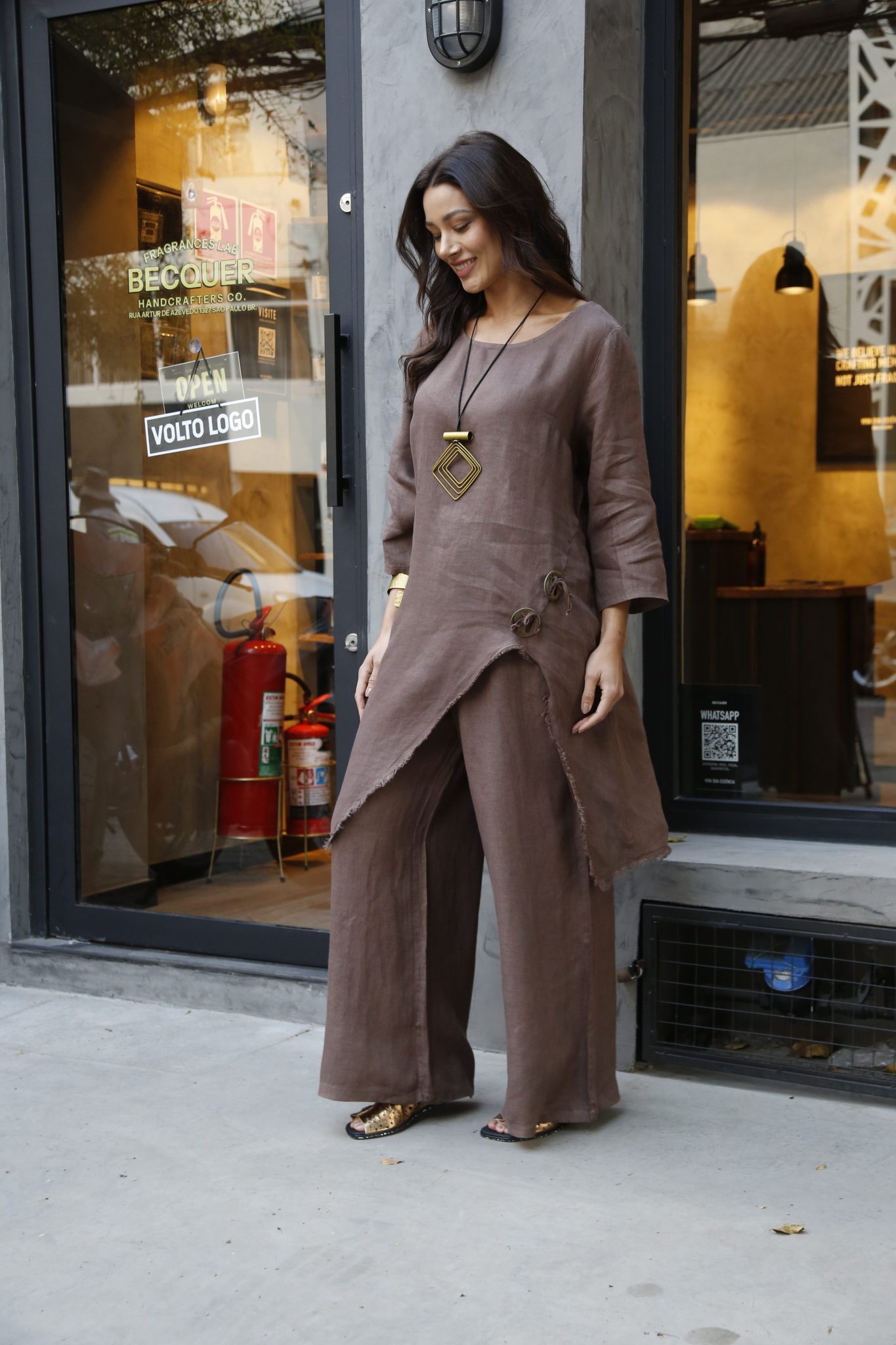 Este conjunto elegante é composto por uma túnica longa assimétrica com detalhe de amarração lateral e uma calça pantalona de caimento fluido. Confeccionado em linho puro, oferece um visual sofisticado e ao mesmo tempo confortável. Ideal para quem busca estilo com leveza e personalidade.