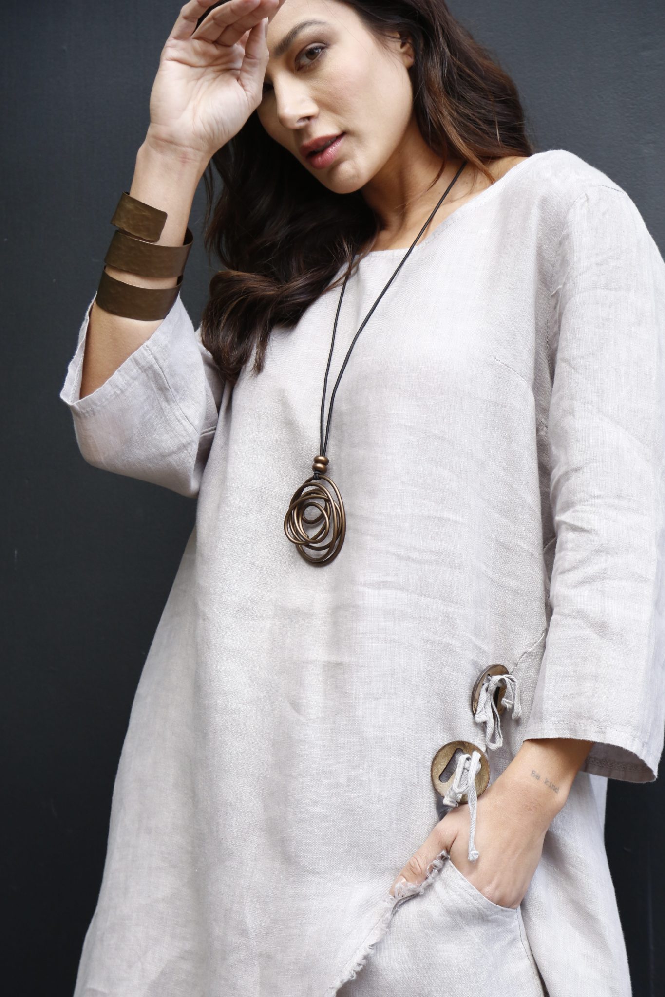 Túnica com acabamento desfiado e detalhe em botão artesanal