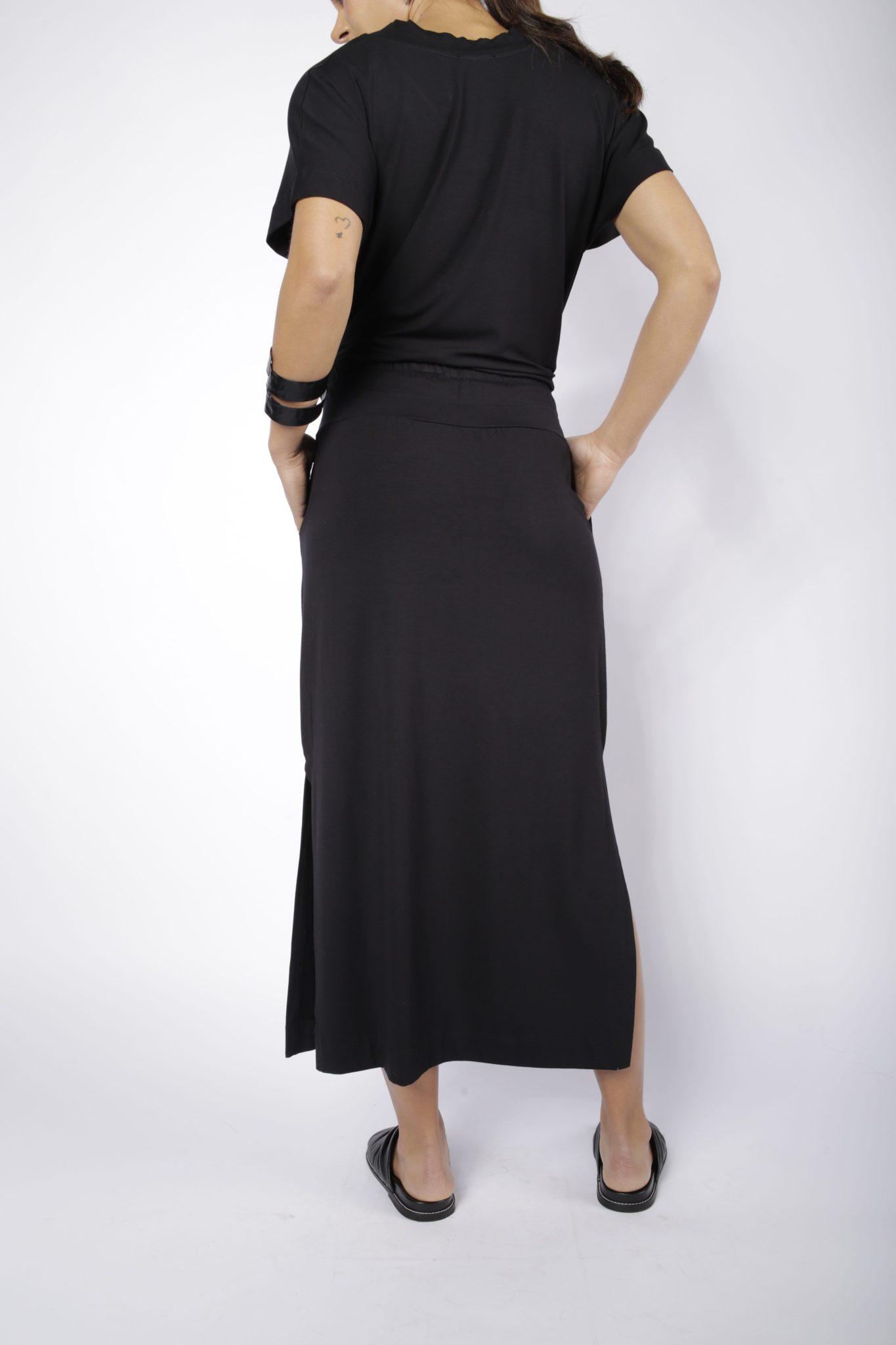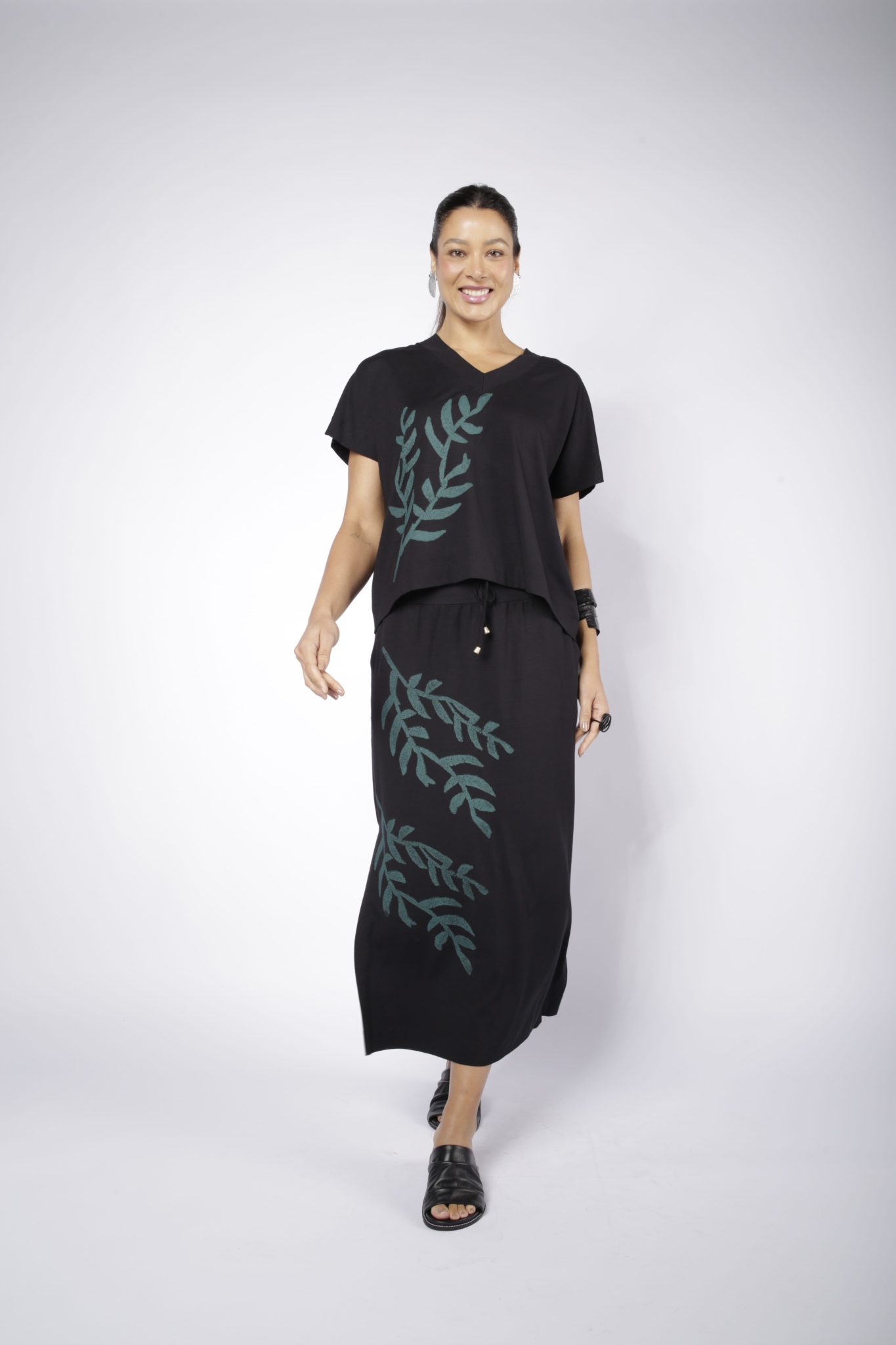 Conjunto Viena em viscose e elastano com estampa artesanal exclusiva da marca, blusa com decote em V e mangas curtas. Saia de caimento reto com bolsos nas laterais e cordão no cós.