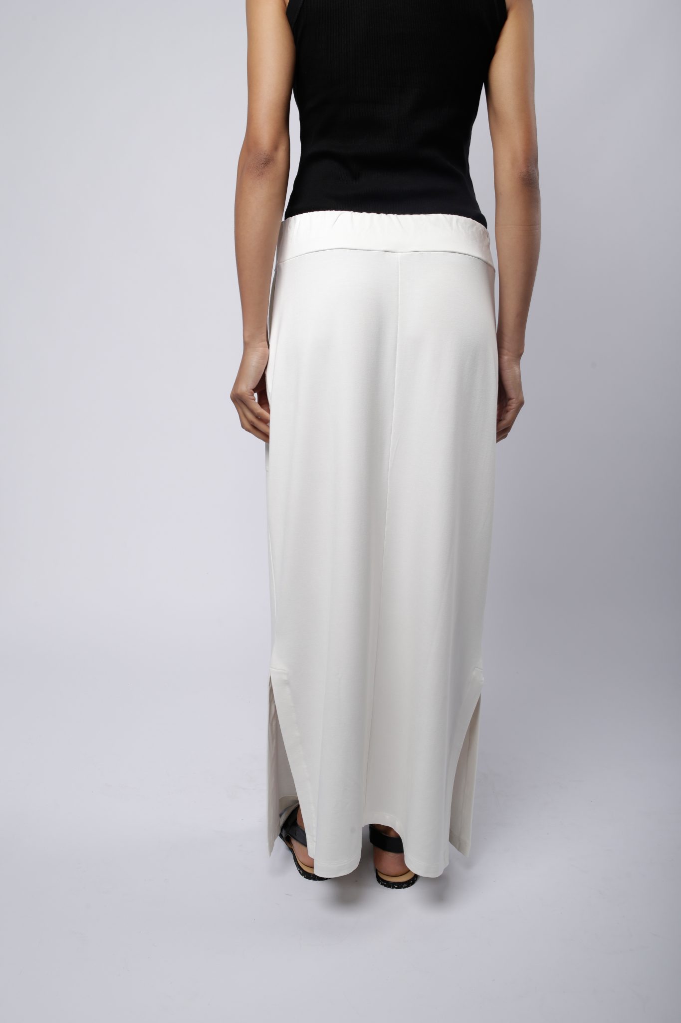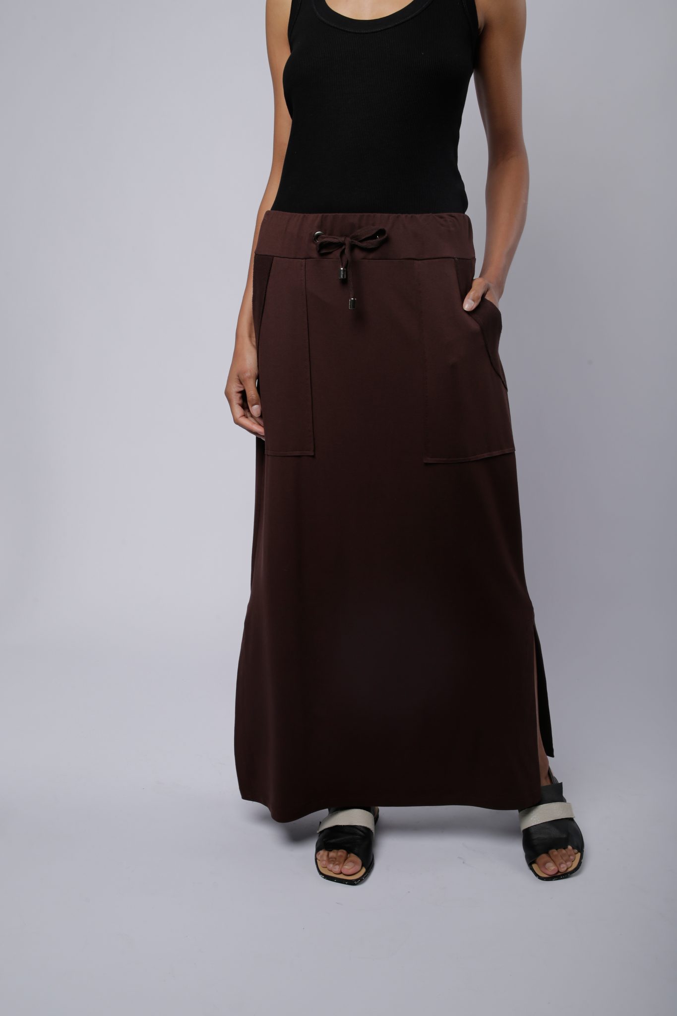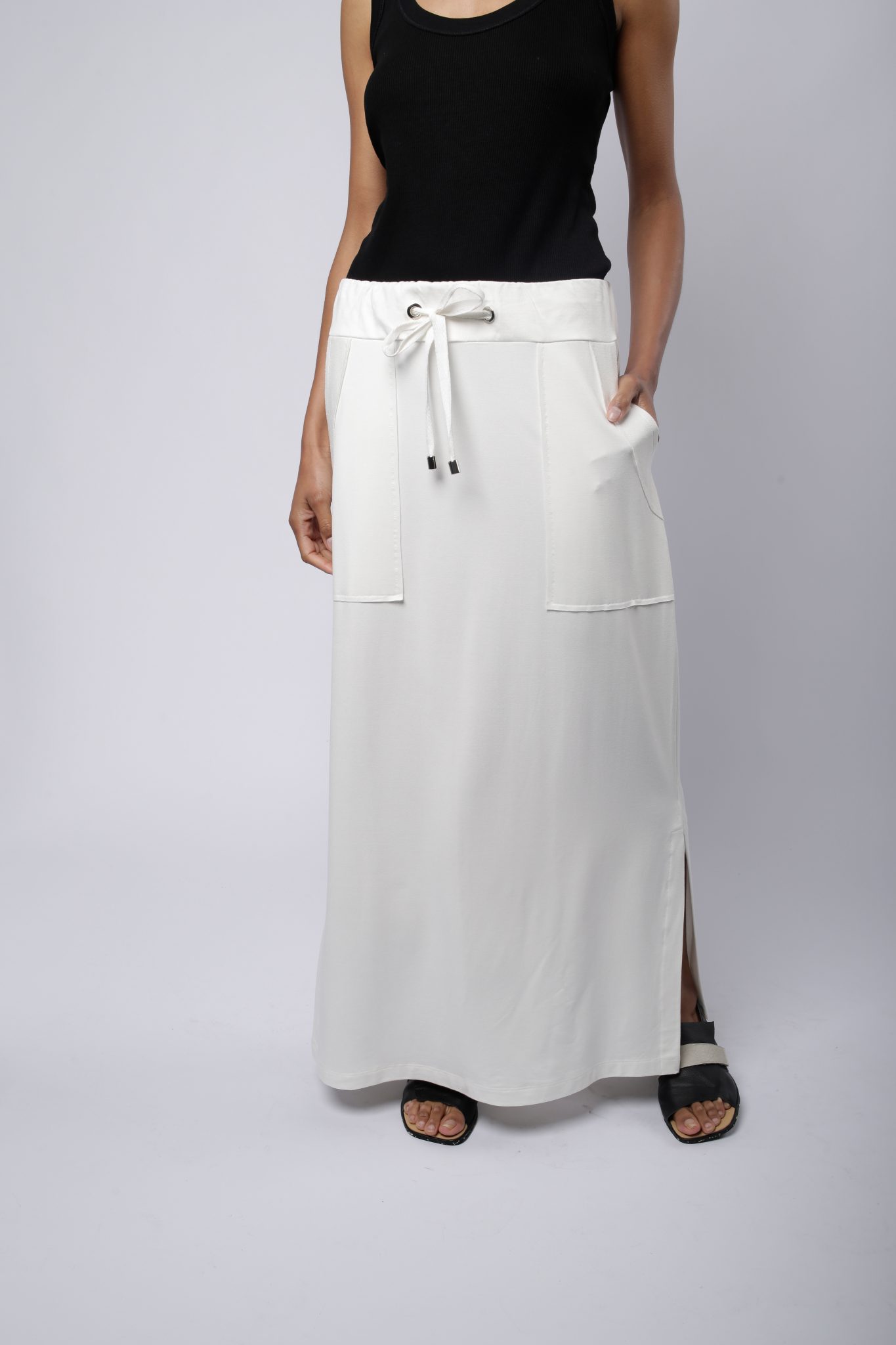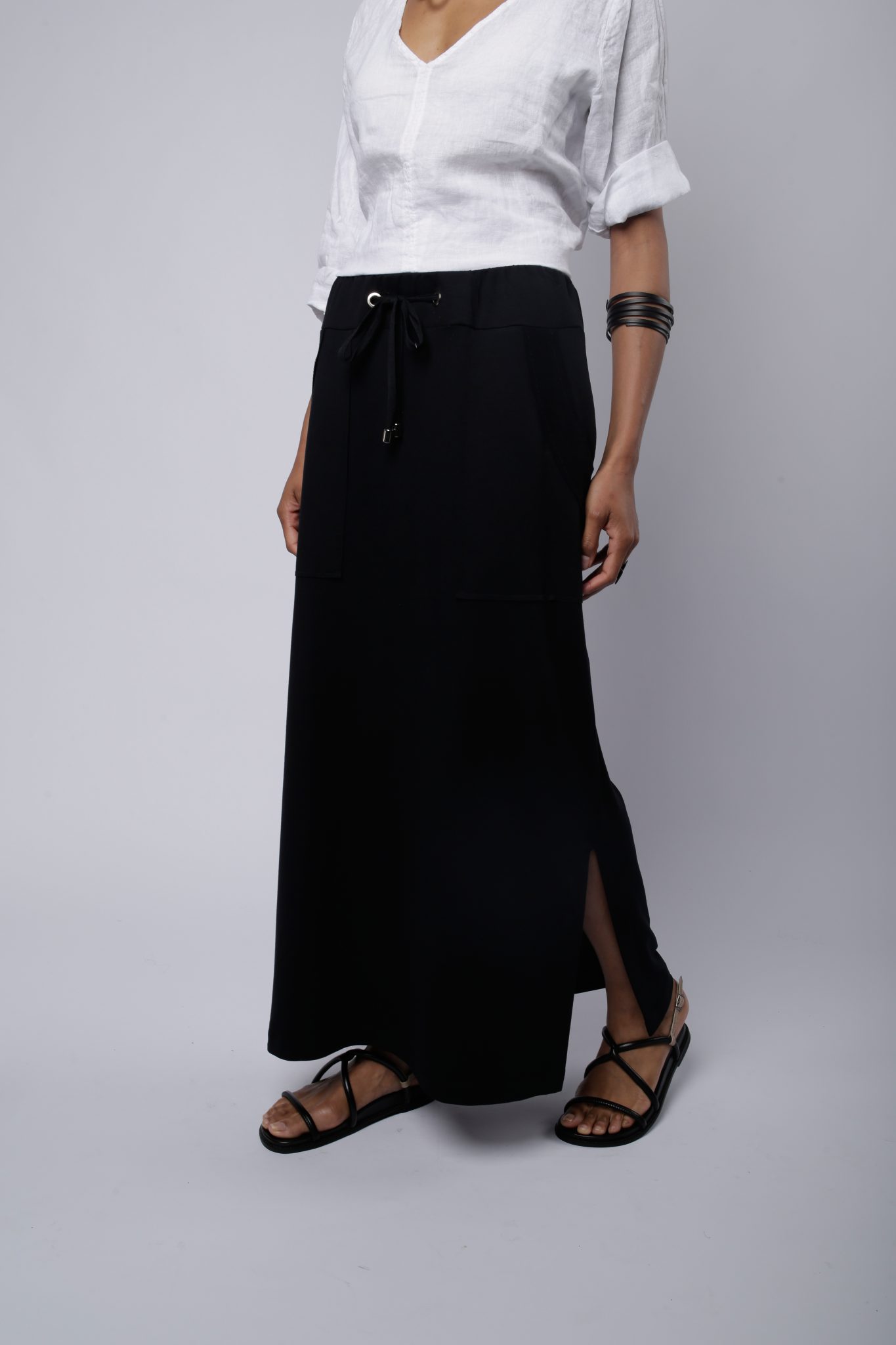 Saia Helena longa em tecido leve com caimento reto, modelo com bolsos nas laterais funcionais e cordão no cós. Confortável e versátil, é ideal para compor looks casuais com estilo e praticidade.