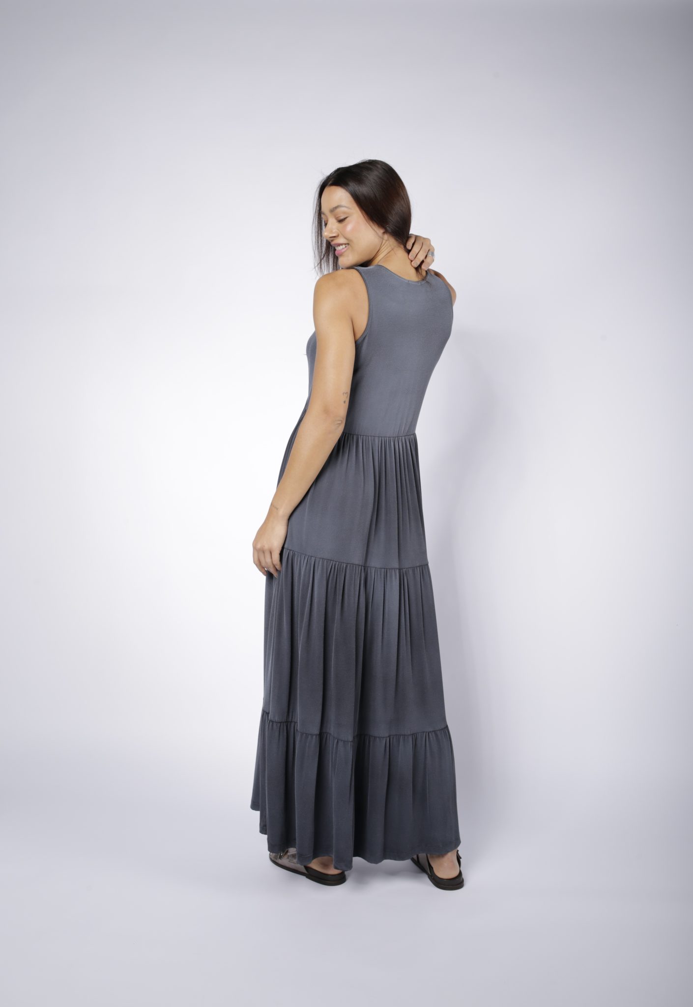 Vestido em viscose e elastano, sem mangas, decote em V e babados delicados, que adicionam movimento e feminilidade à peça.