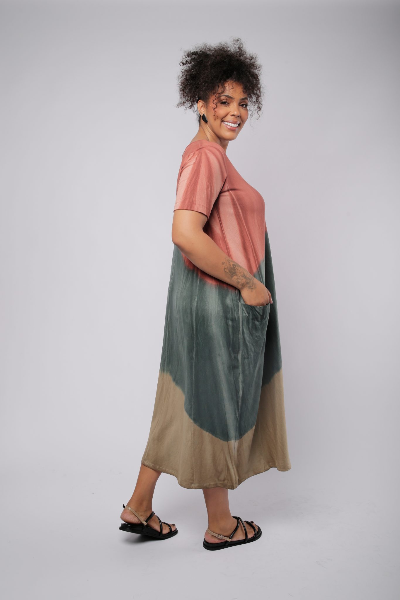 VESTIDO ROMA ESTAMPADO EM VISCOSE E ELASTANO BOLSOS NAS LATERAIS E MANGA CURTA – TERRA