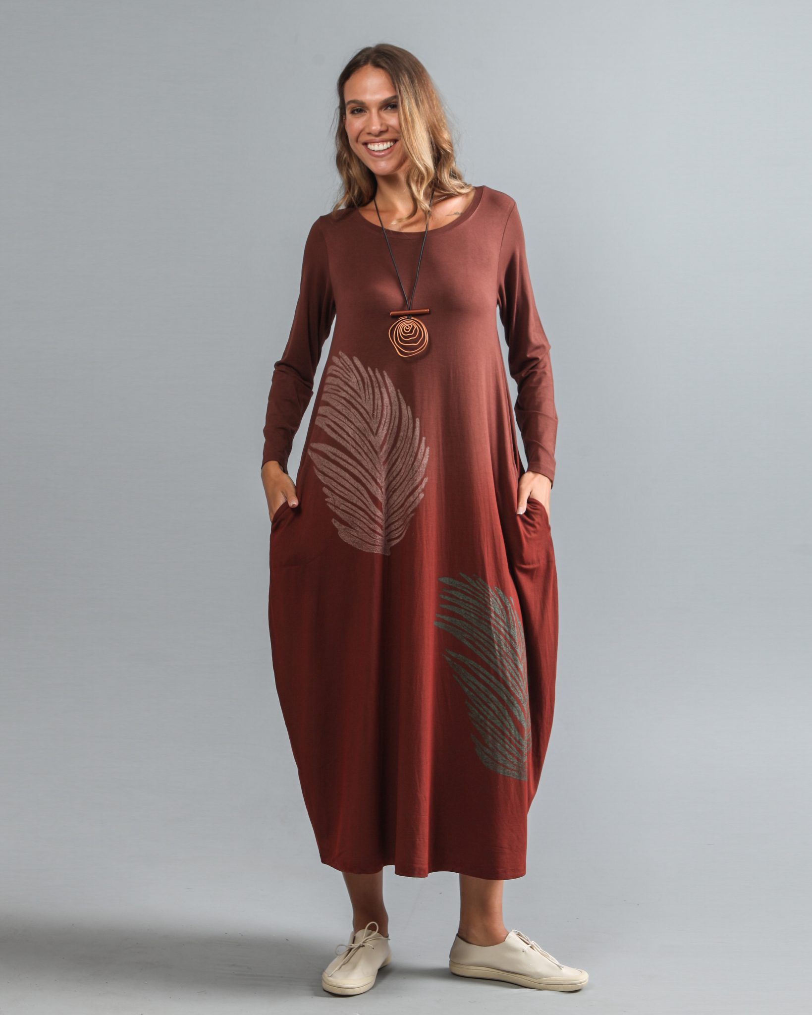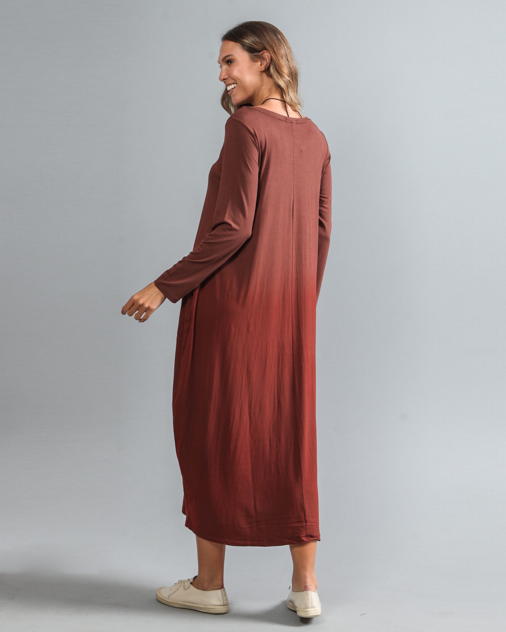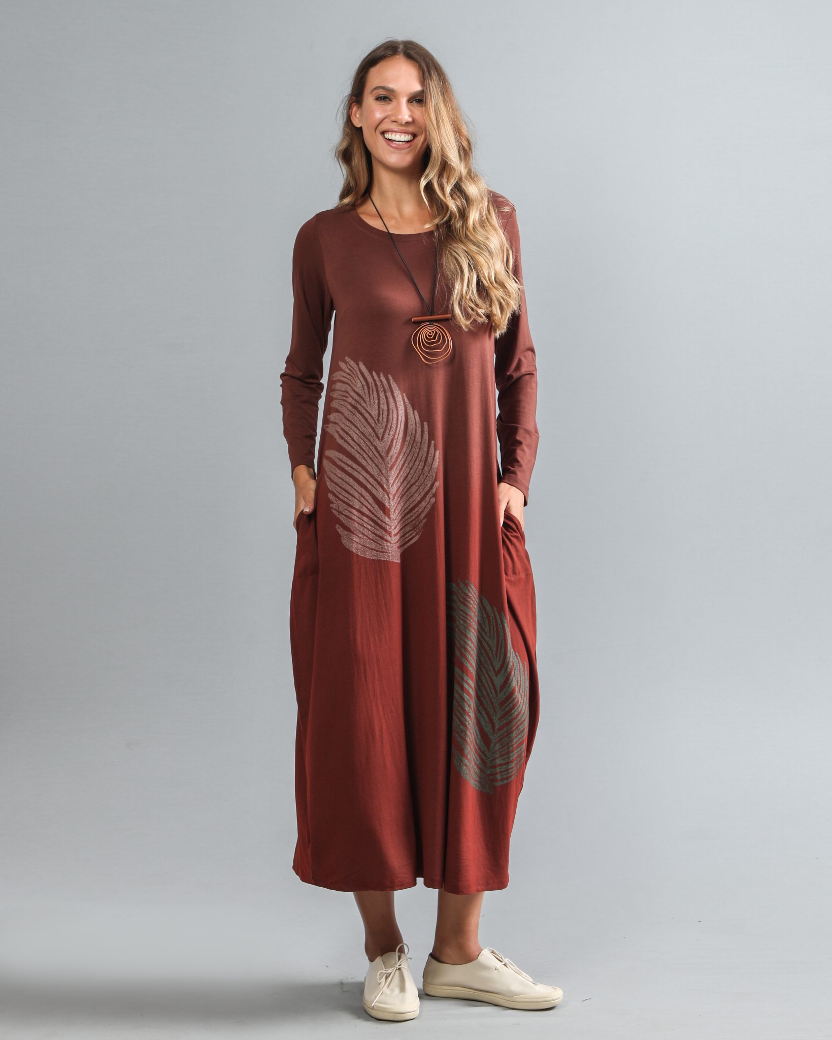 VESTIDO STREET EM VISCOSE E ELASTANO BOLSOS NAS LATERIAS MANGAS LONGAS – MARROM